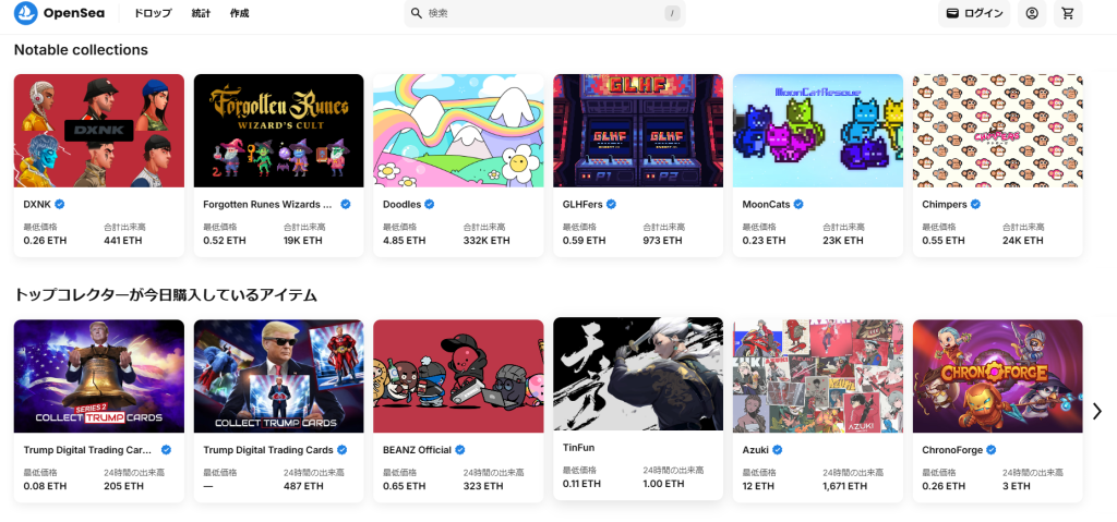 • :OpenSeaのトップページにはカテゴリ分けや検索バーが配置され、NFTを簡単に探せるよう工夫されています。